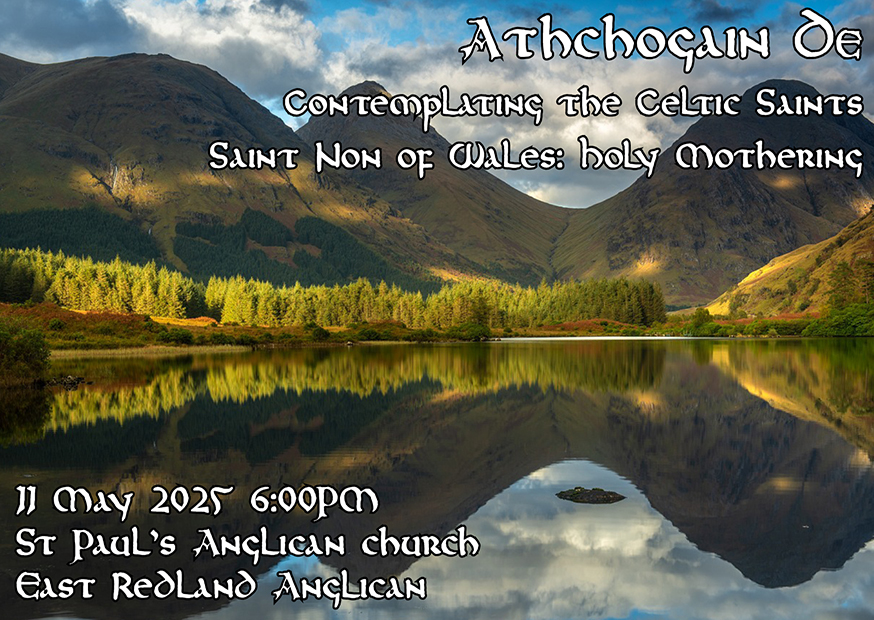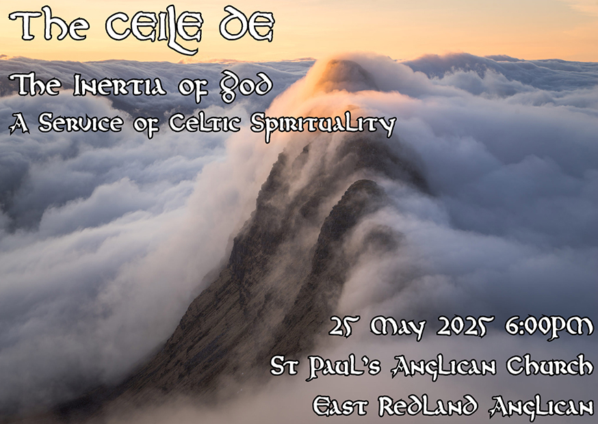 At 6:00 p.m. on the Second Sunday of each month, East Redland Anglican offers “The Athchogain De Service”. The Athchogain De is a time of meditation and contemplation based on the Celtic spiritual tradition. This will be a non-eucharistic service which combines meditative silence, the simplicity of utterance, and a place where we can “ruminate” on the word of God as a part of the lives of the Celtic Saints.