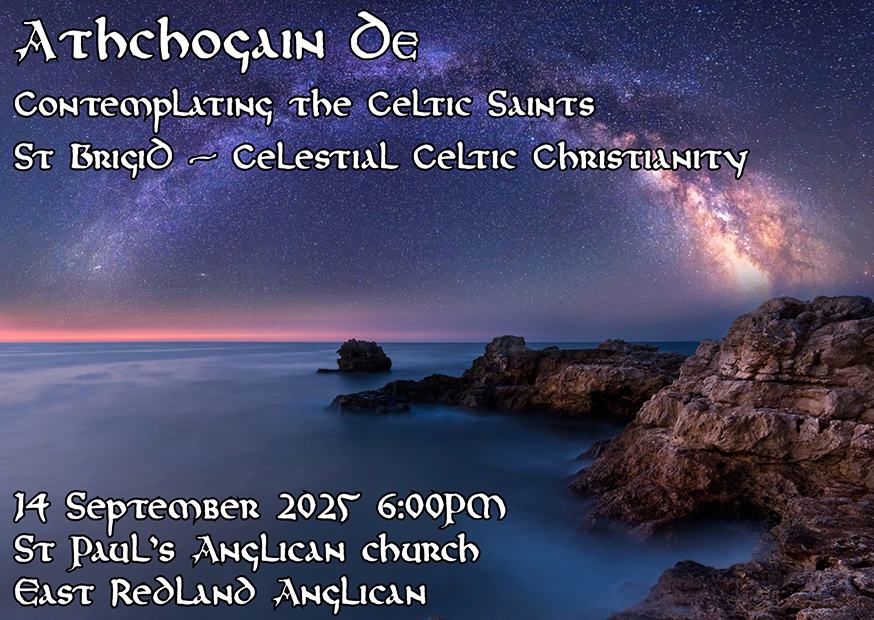 The Athchogain De At 6:00 p.m. on the Second Sunday of each month, East Redland Anglican offers “The Athchogain De Service”. The Athchogain De is a time of meditation and contemplation based on the Celtic spiritual tradition. This will be a non-eucharistic service which combines meditative silence, the simplicity of utterance, and a place where we
